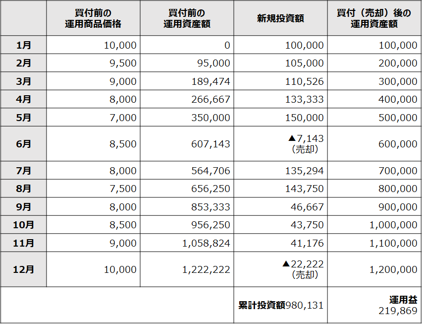 前回の買付時から値下がりした月は運用資産額がその月の目標額を下回るため、新規投資額は10万円を超えます。一方、前回の買付時から値上がりした月は、運用益の分だけ新規投資額は少なくて済み、10万円を下回ります。